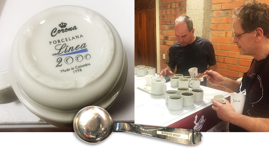 De eerste proefronde gebruiken we om de scores van alle proevers te kalibreren en om de ‘corona’- procedure te oefenen. Het is koddig en best lastig om zo’n nieuwe manier je eigen te maken. Ik kijk verwonderd naar sommige branders die 3 kommetjes tegelijk in één hand houden … dat lukt mij niet. Ik ben diep onder de indruk van de bijzondere proeflepel die ik nu in mijn handen krijg: nog nooit gezien, schept heel fijn en heeft mijn naam erop! (zie de foto) Dan, als ik geslurpt heb van mijn proefkop, gooi ik het restant van de inhoud koffie in mijn spuugkom en zie bij toeval op de onderkant van het proefkopje de merknaam van het servies staan: Corona !