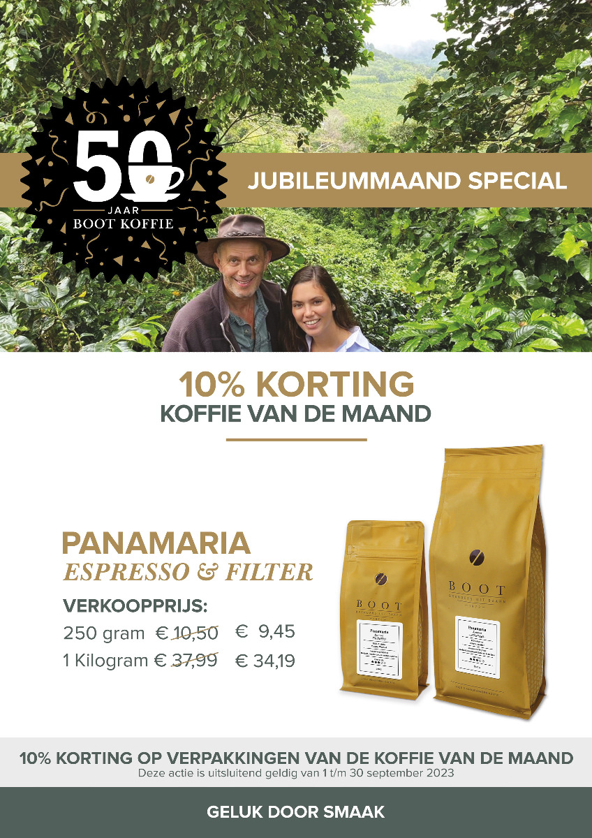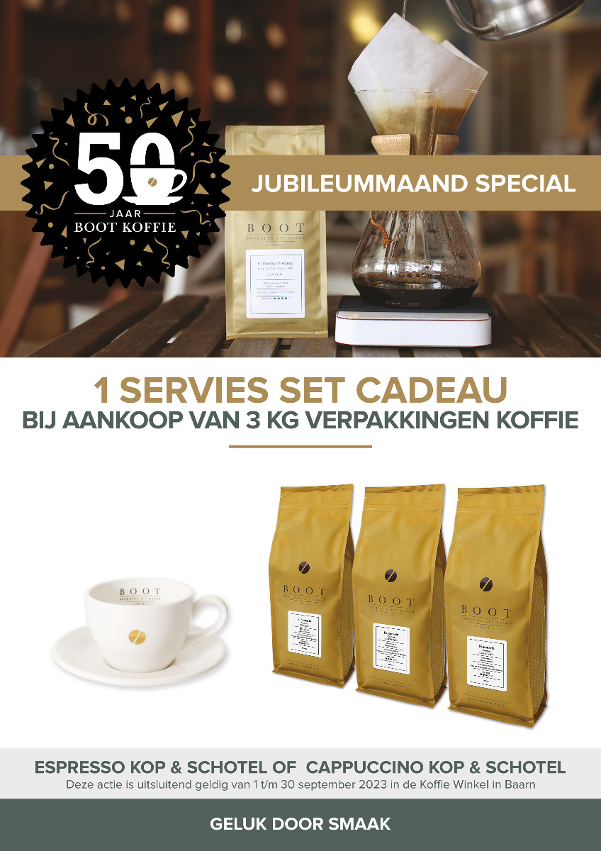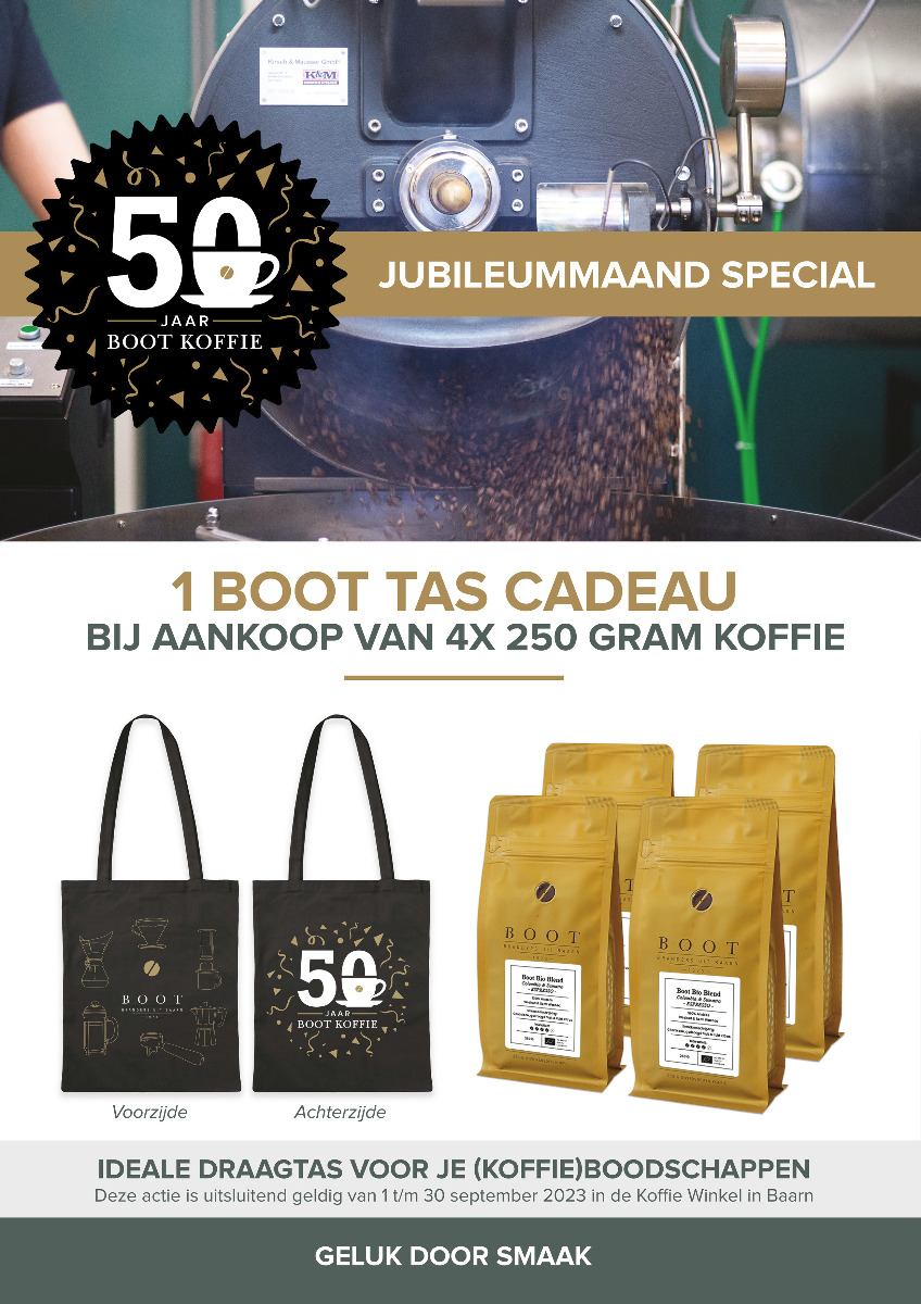 De Koffie Winkel in Baarn viert een hele maand lang feest ter ere van het 50-jarig bestaan van Boot Koffie. En jij bent uitgenodigd om mee te vieren! Het enige wat je hoeft te doen is langskomen in de winkel en genieten van de mooiste koffiesoorten die Boot Koffie te bieden heeft. Elke zaterdag van de maand september laten wij je een bijzondere filterkoffie proeven.